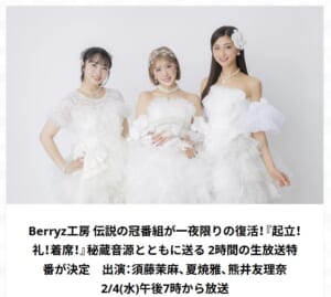 活動停止中の Berryz工房がパーソナリティを務めていたラジオ番組『Berryz工房 起立!礼!着席!』が、一夜限りの特別番組として復活する。 番組は『Berryz工房 起立!礼!着席! 浜松町de同窓会』と題し、2026年2月4日(水)19時から文化放送にて2時間の生放送で届けられる。 登場するのは、2026年現在 … 続きを読む 活動停止から11年 Berryz工房の伝説的ラジオ番組が一夜限りで復活